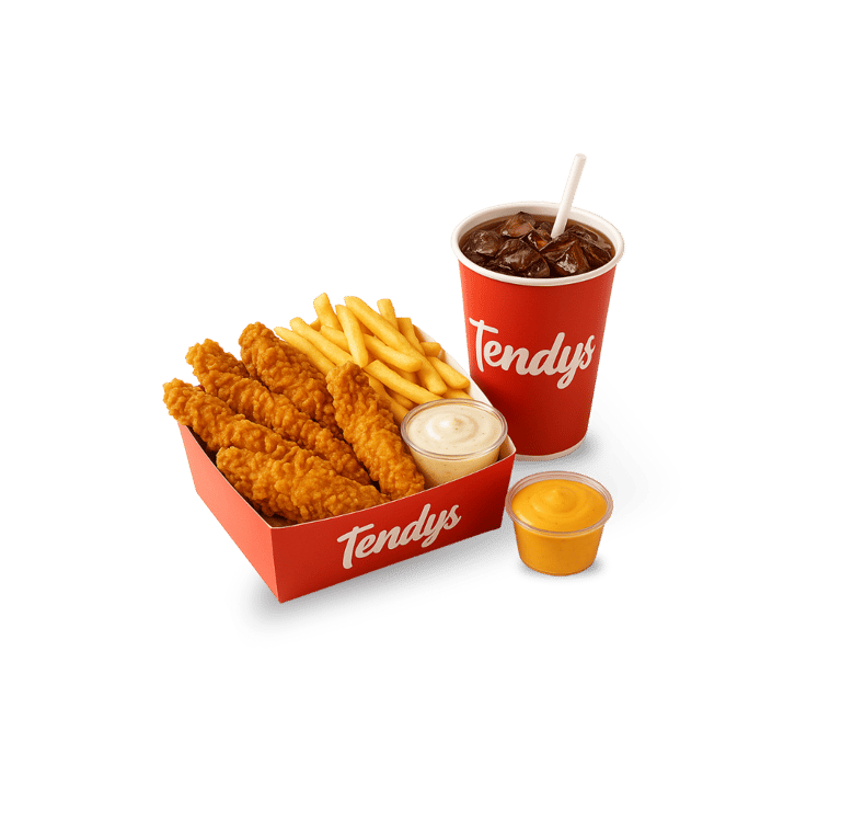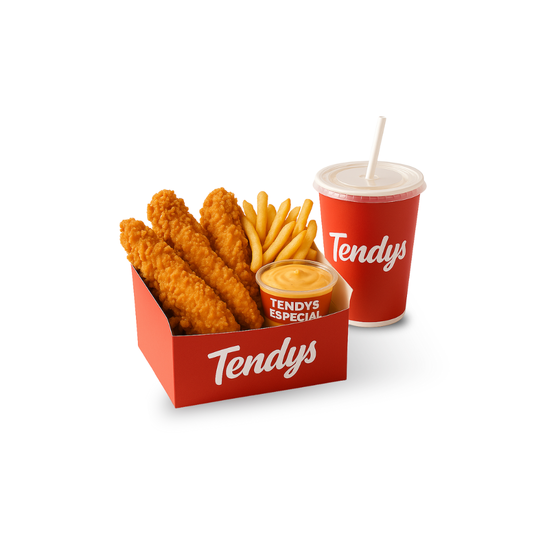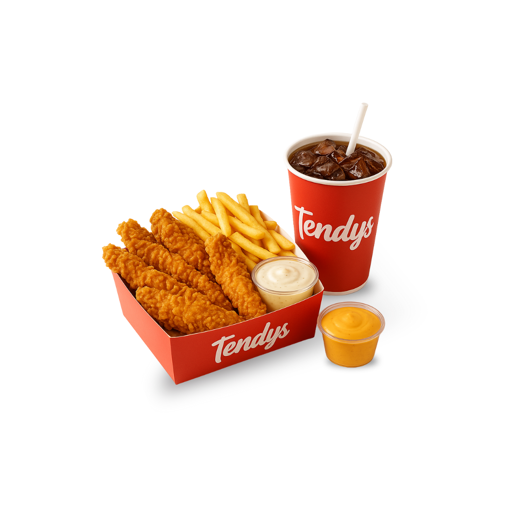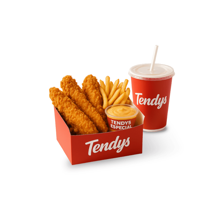 4 tenders crujientes, papas clásicas, tu dip favorito y bebida.