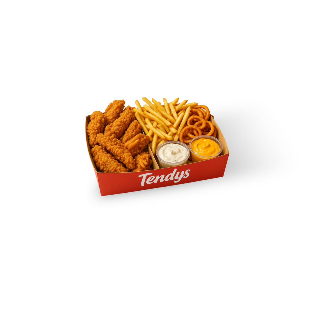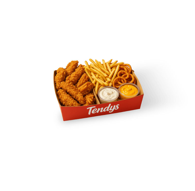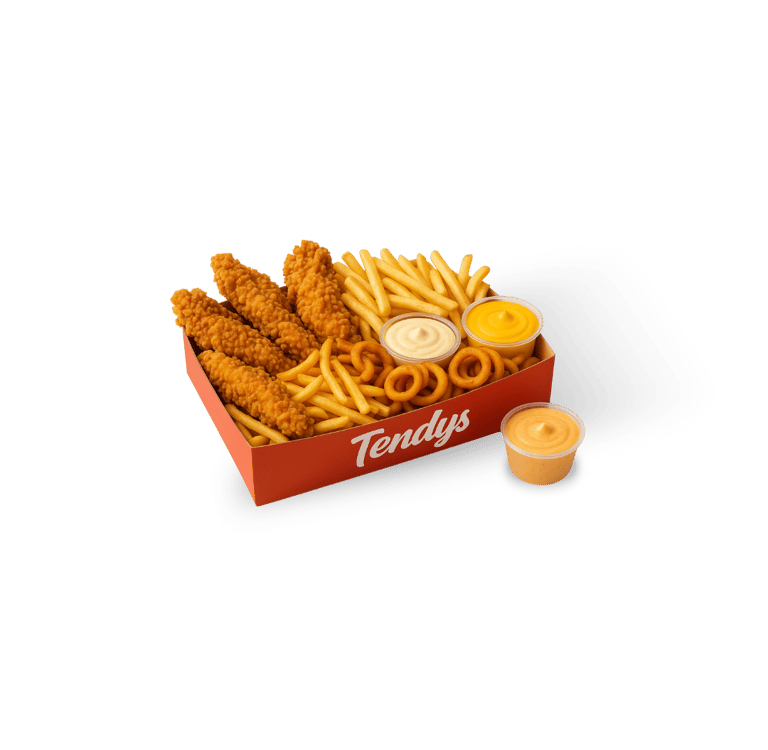 3 Tenders crujientes, papas, tu dip favorito y bebida.